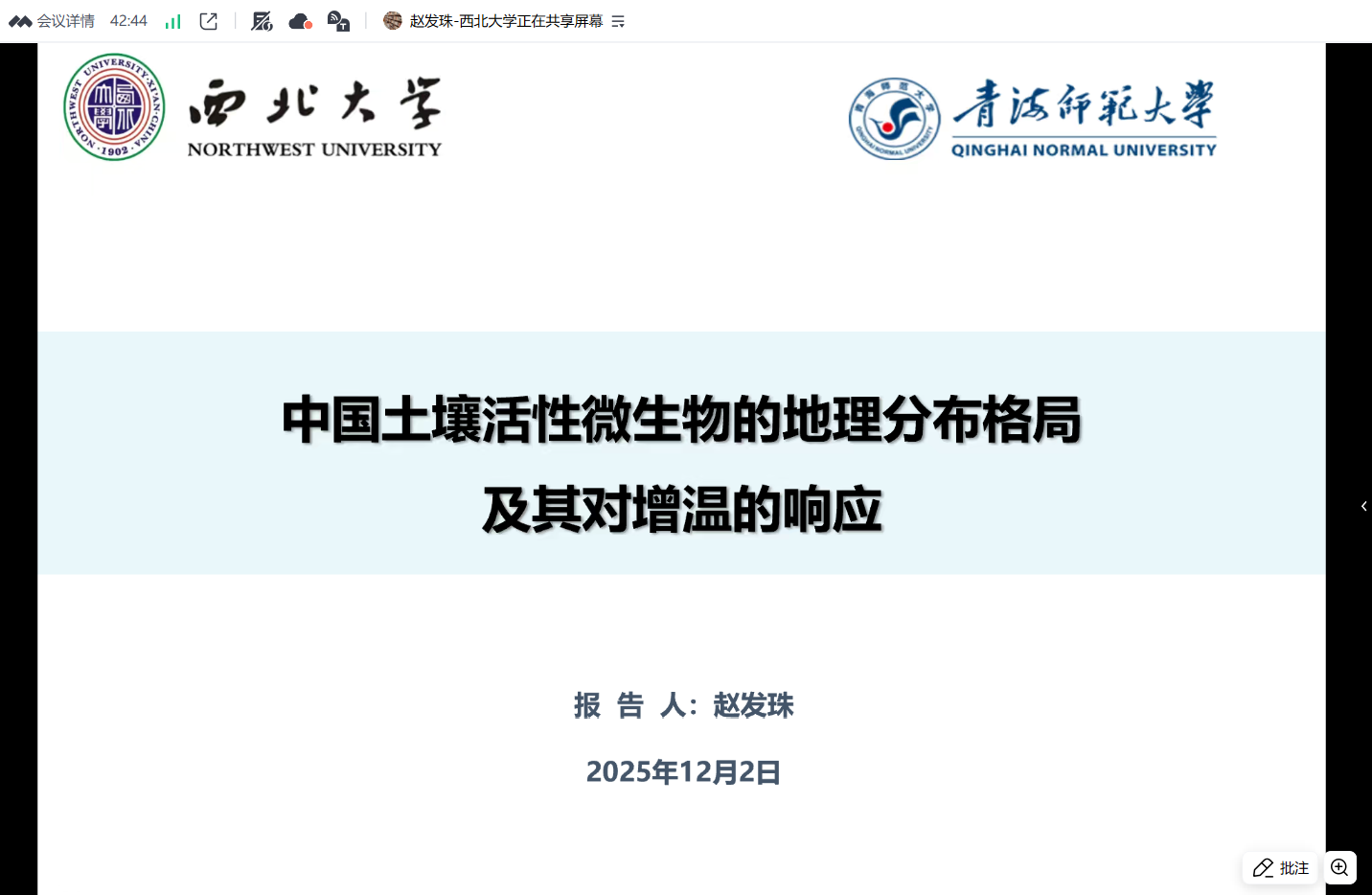 2025年12月2日晚,西北大学城市与环境学院赵发珠教授应青海省青藏高原生物多样性形成机制与综合利用重点实验室邀请,在线上作了题为《中国土壤活性微生物的地理分布格局及其对增温的响应》的学术讲座。本次讲座由sm调教