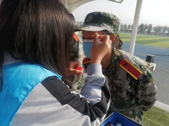 活动期间,校医务室提供了防感冒腹泻、防晒伤及跌打摔伤等常用药品和应急医疗保障所需的氧气罐、轮椅、担架等医疗器材;明德物业保障了桌椅、运输工具等后勤物资。志愿者们在田径场服务点准备了遮阳棚、热水,给体力不支的同学提供休息场所;对训练中出现高原反应等情况的同学提供药品,帮助他们尽快康复;为军训时意外受伤的同学进行包扎伤口,将受伤较重的及时送往校医务室。