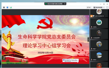 会上进行了中心组成员交流发言。王文颖教授以《奋力书写生命科学教育新篇章 加快建设人与自然和谐共生现代化》为题,从优化创新资源配置,推动学院高质量发展;立足高原生态环境保护,助力人与自然和谐共生现代化两方面进行了交流。谢惠春同志从加快培养创新人才,强化现代化建设人才支撑;加快推动科技创新,实现高水平科技自立自强;加快推进内涵式发展,努力构建中国特色社会主义高质量高等教育体系三方面进行了交流。陈振宁教授表示作为新时代的高校教师,要以党的二十大精神作为工作和生活中的风向标,切实把思想和行动统一到大会精神上来,深学细悟,真正的做到入心入脑,不断提高自己政治理论水平和文化素养,做到学有所思、学有所悟、学有所获,坚决贯彻落实党的“立党、立德、树人”的教育方针,听党指挥,团结老师,把力量凝聚到培养德智体美劳人才的教育目标的各项任务上来,推动教学工作、指导教学实践。杨继军同志表示学习贯彻党的二十大精神,最好的行动就是与实际结合。大学生是党和国家的宝贵财富,用心用情培养德智体美劳全面发展的学生,是党赋予我们的责任。对于高校教师来说,教学生知识、教学生做人,就是对党负责的具体体现,就是实实在在地贯彻党的二十大精神。