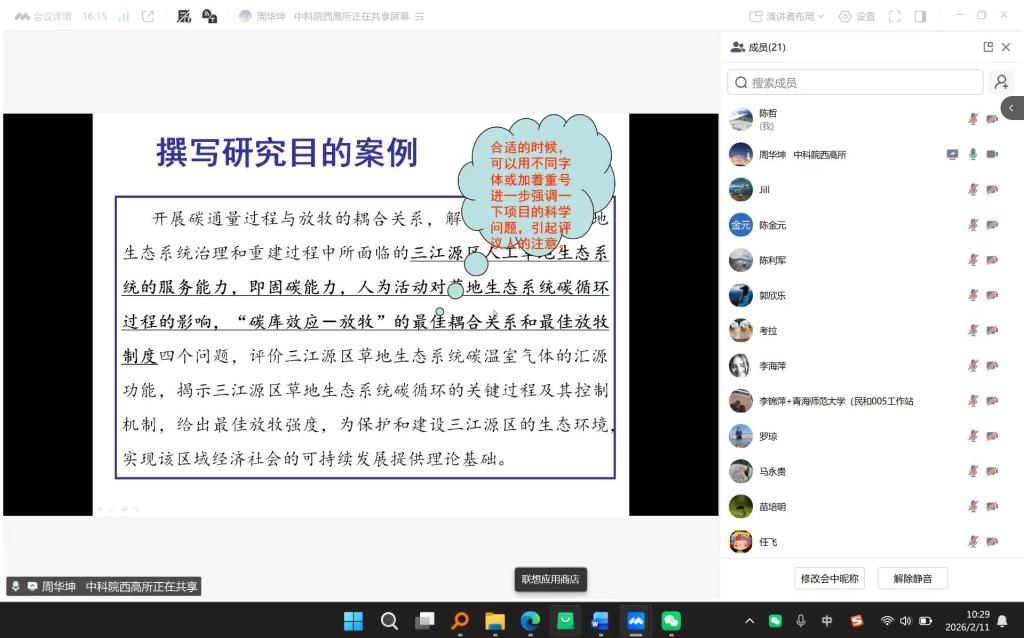 于2月11日上午,以线上形式举办第二次申报研讨会。会议特邀中国科学院西北高原生物研究所周华坤研究员担任主讲嘉宾。学院20余位教师积极参与,会议由陈哲副院长主持。