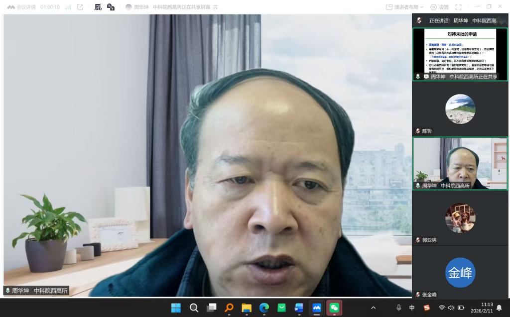 周华坤研究员以《申请国家自然科学基金的一些体会和认识》为题,结合自身多年申请和评审经历,从政策导向、基金架构、同行评审、选题切入点、立项依据、研究基础、创新点等方面进行了系统深入的分析。深度解读了2026年国家自然科学基金评审新动向,系统介绍了申请书各环节撰写要点,分享了“准、精、实、细”四字心得。在互动环节,周华坤研究员就申报教师提出的问题,结合教师申报书文本给出了建设性修改意见。