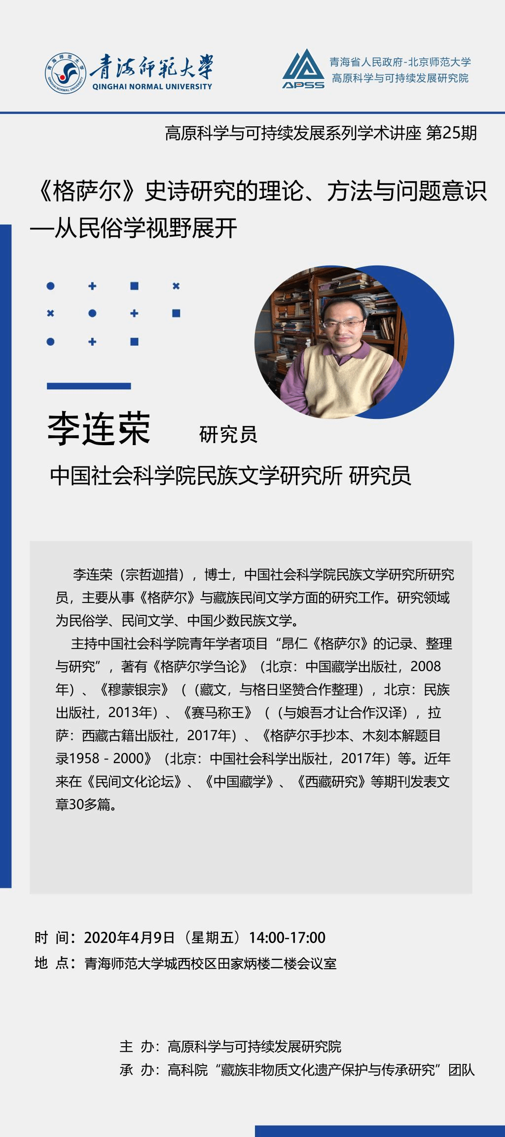为促进我校学术交流合作,拓展师生的学术视野,定于4月9日举办高原科学与可持续发展系列学术讲座(第25期)两场。现将有关事项通知如下: