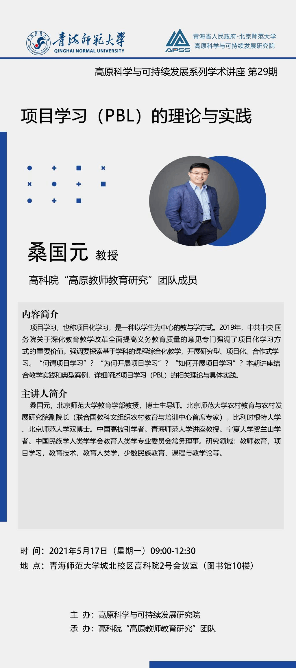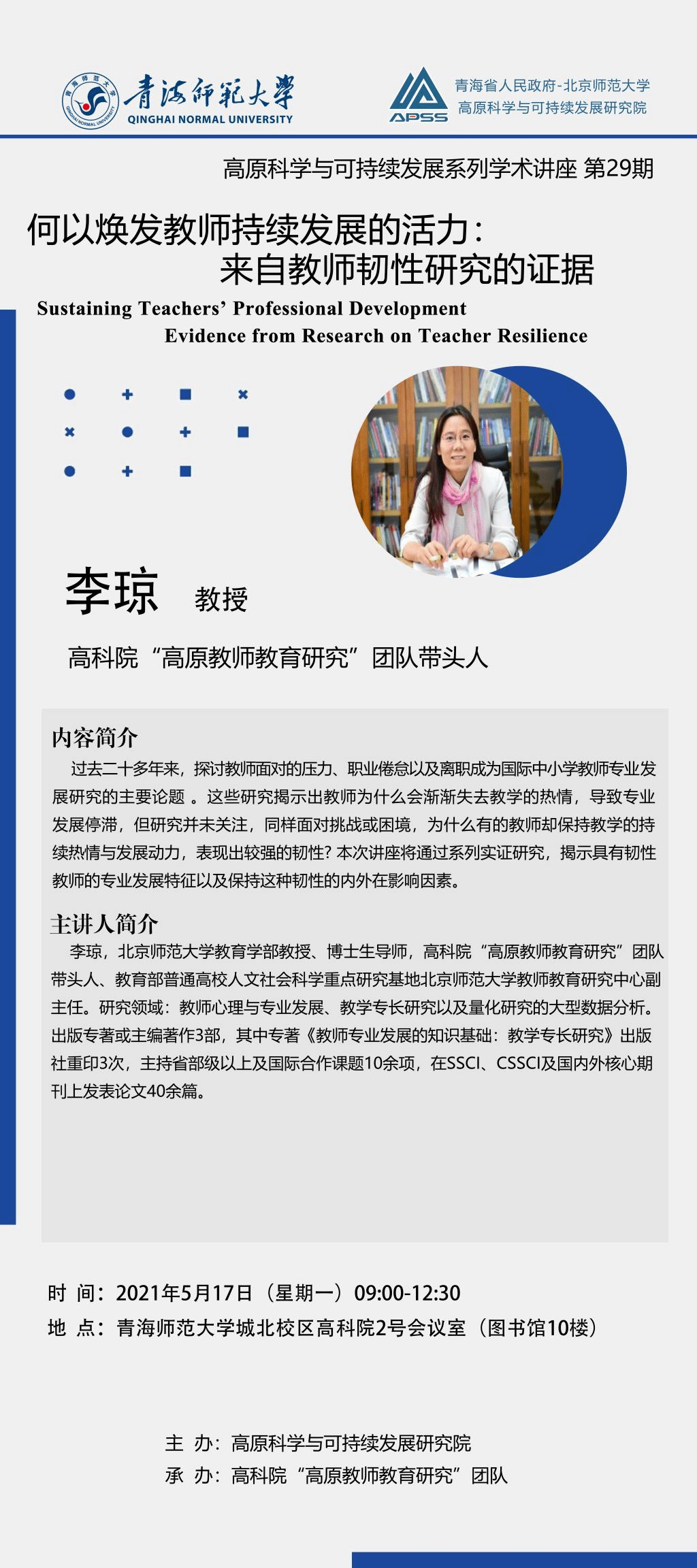 为促进我校高原教育研究领域的学术交流与合作,深化我校高原教师教育及高原脑认知领域的研究,定于2021年5月17日(星期一)举办“高原科学与可持续发展系列学术讲座”(第29期)三场。现将有关事项通知如下: